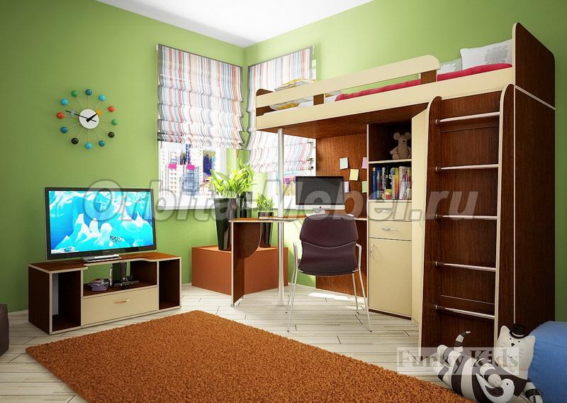Кровать чердак Фанки Кидз -1 Лайт (корпус орех / фасад крем ваниль) + посдставка под ТВ 1ФМ