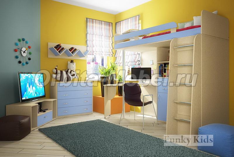 Кровать чердак Фанки Кидз -1 Лайт (корпус дуб кремона / фасад голубой) + комод 1ФМ + полка 1 ФМ + подставка под ТВ 1ФМ