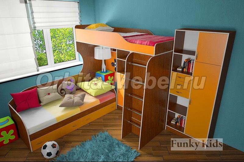 Кровать чердак Фанки Кидз 7/1 + кровать с двумя выдвижными ящиками + стеллаж для книг корпус орех / фасад оранжевый