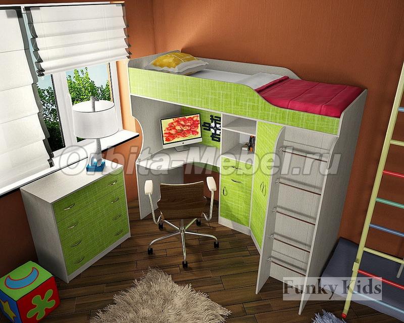 Кровать чердак Фанки кидз 7 + комод корпус сосна лоредо / фасад текстиль