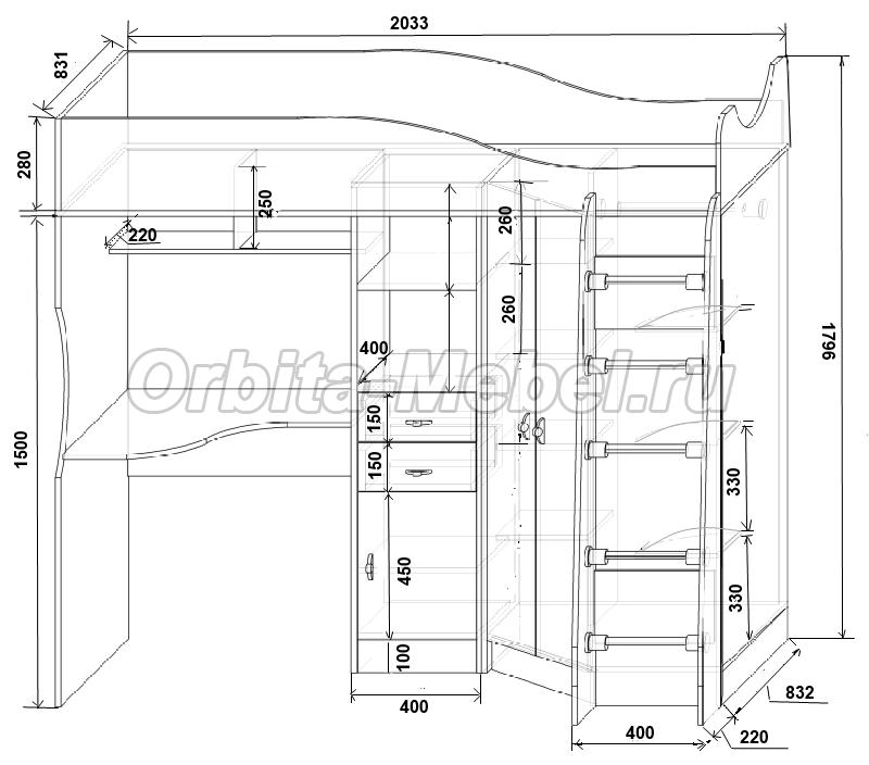 Кровать чердак Фанки Кидз 7 - схема с размерами