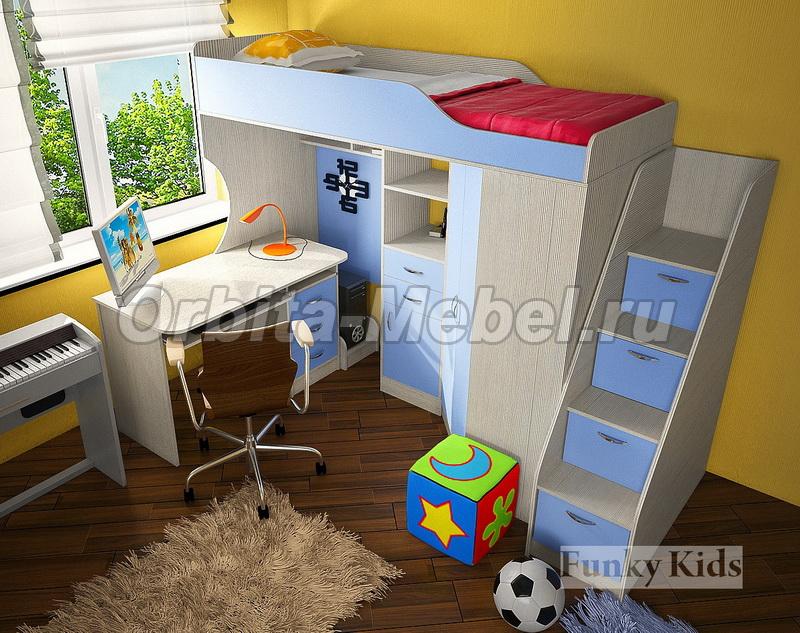 Кровать чердак Фанки кидз 7/1 + стол компьютерный + подставка под процессор + лестница - комод корпус сосна лоредо / фасад голубой