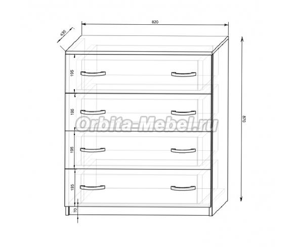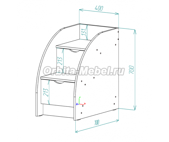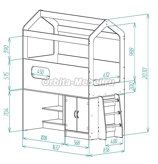 Кровать: Д188,2*В203*Ш83,6 см. Комод: В87*Ш82*Г43,5 см. Лестница: В70*Ш40*Г70 см. Шкаф: В200*Ш75*Г52 см.