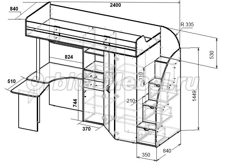 Кровать чердак Фанки Кидз 1 Гранд схема с размерами