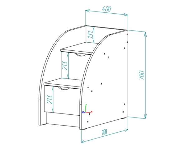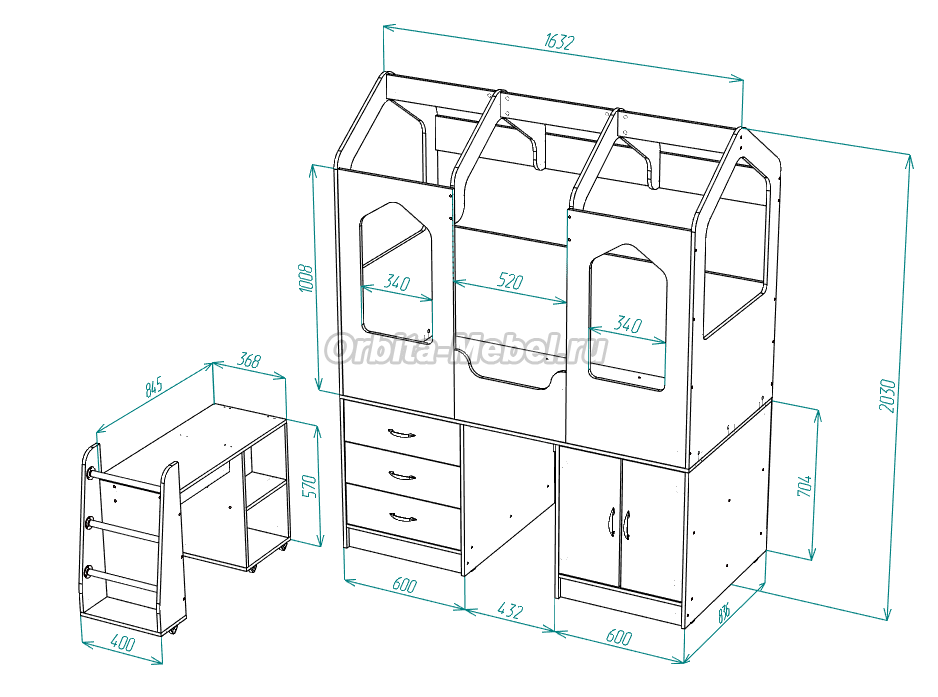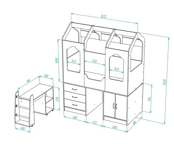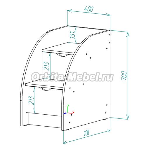 Кровать-чердак: Д163,2*В203*Ш83,6 см. Тумба-лестница: Д70*В70*Ш40 см.