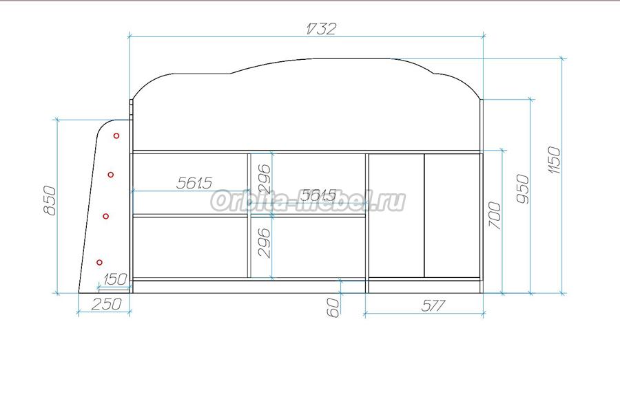 Общая схема и размеры детской кровати с лестницей Лесная Сказка