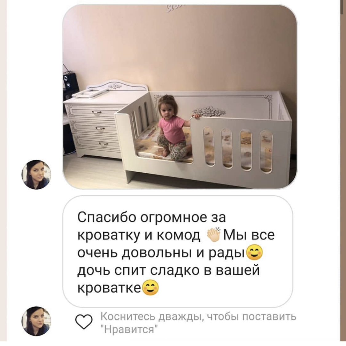 Добрый день) кровать получили, собрали) поделюсь фото с вами. Ребенок доволен. Отличный ящик для белья 😎много ее вещей туда влезло)). Мои родители в восторге, чего сейчас только нет для детей ) мне 1,6 года. P.S. В комплекте есть бортик ограничитель, но нам он не пригодился, она сама слазит и залезает на нее. Буду ставить только на ночь, чтобы не упала. Мама.)))